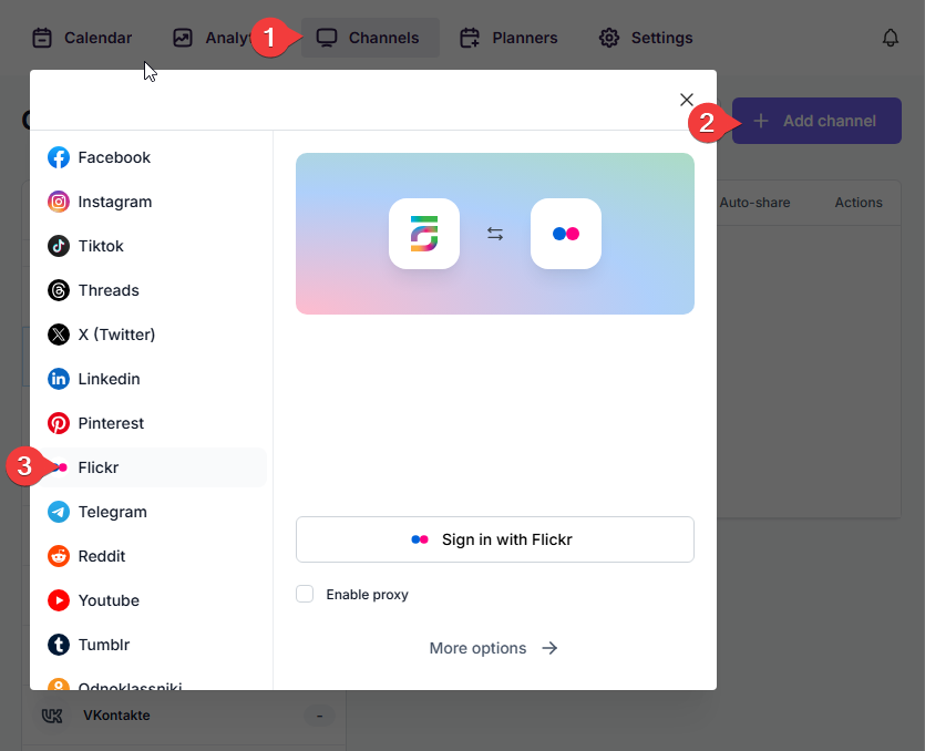 In the opened window, find Flickr in the list and click the Sign in with Flickr button to add your accounts to the plugin.