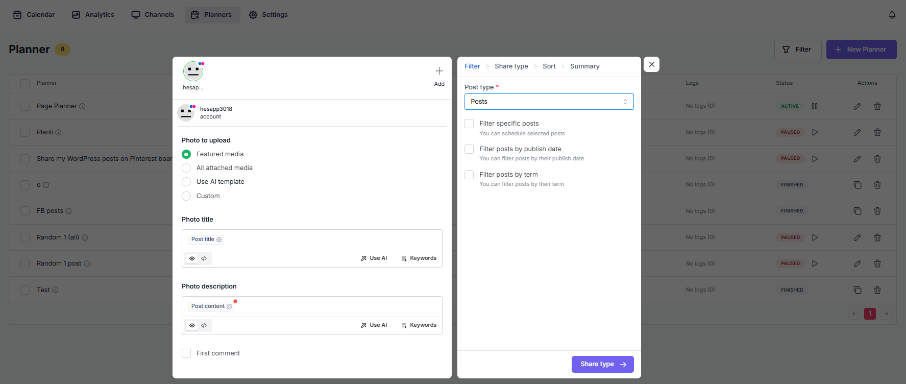 Select your Flickr channel, configure which posts to share (by category, tag, date, or specific posts), set the interval, and activate the planner.